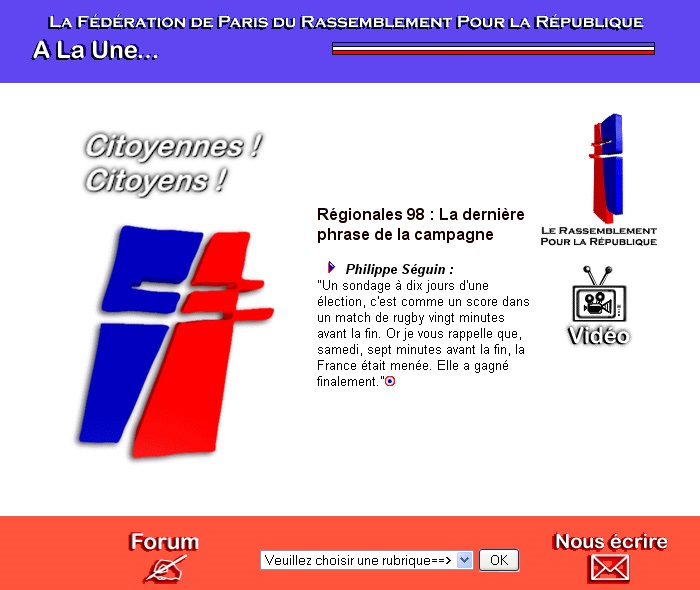 A cette heure, l'ensemble des mouvements politiques majeurs qui composent la France, sont présents sur l'Internet. P.S., P.C., U.D.F, R.P.R, et F.N. Les quatre groupes traditionnels propose des sites (services Internet) essentiellement institutionnels et présentent les grandes lignes de leurs idées et convictions. Le Front National est lui très actifs en matières de communications électroniques, leur site donne, depuis 1996, la possibilité d'écouter les discours de ses leaders. On y observe une mise à jour régulière des informations, Ils interviennent systématiquement sur le site RPR.ORG. Organisé, efficace, ils occupent le terrain de l'Internet français, par ailleurs, leur électorat composé souvent de personnes isolées trouve réponse aux angoisses et problèmes qui les assaillent. Cette stratégie, de délocalisation n'est, ni un effet du hasard, ni une fatalité, mais la réelle volonté politique de s'imposer avec le temps avec un média de proximité à fort potentiel de croissance.